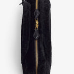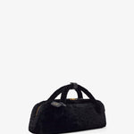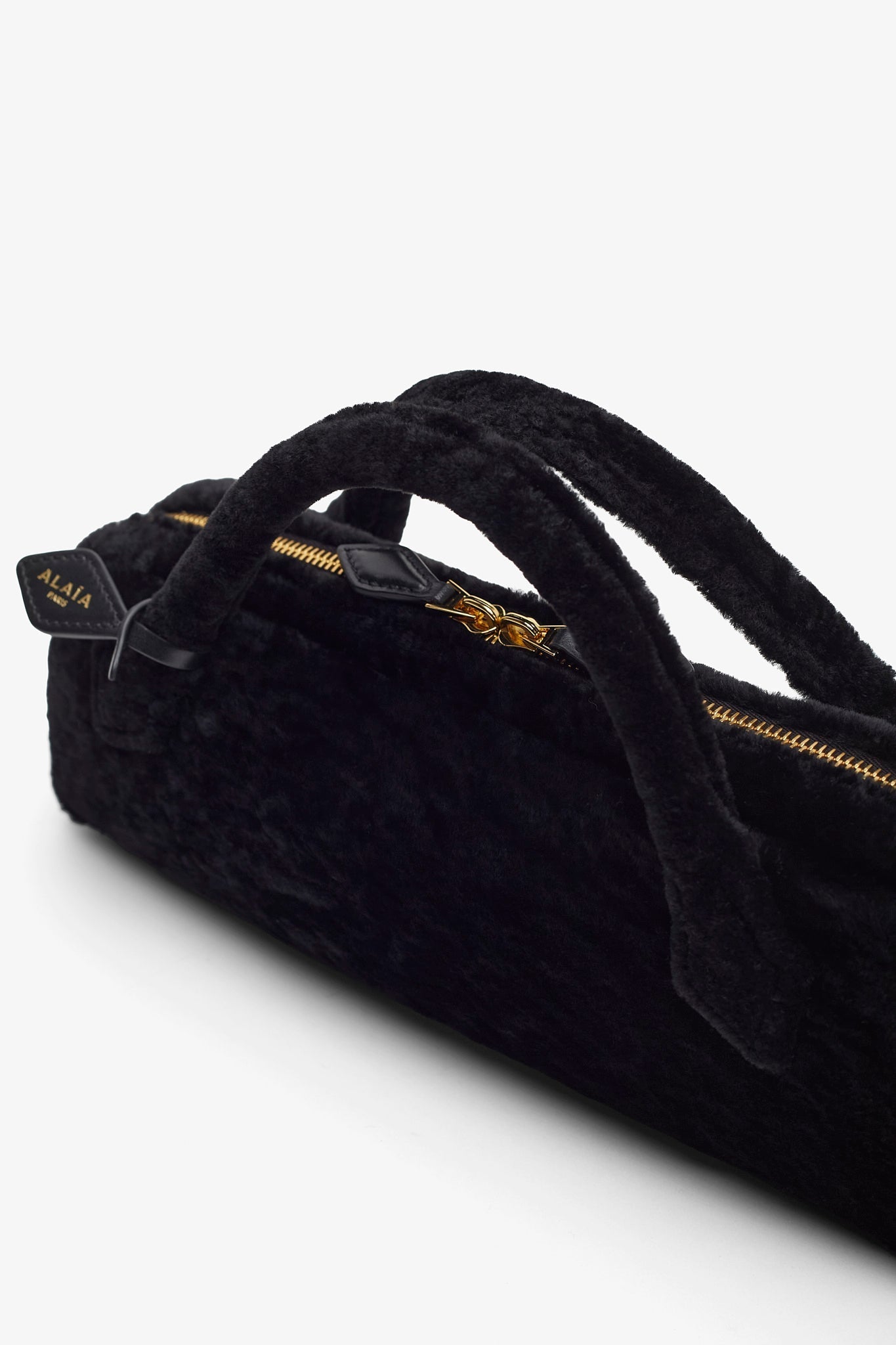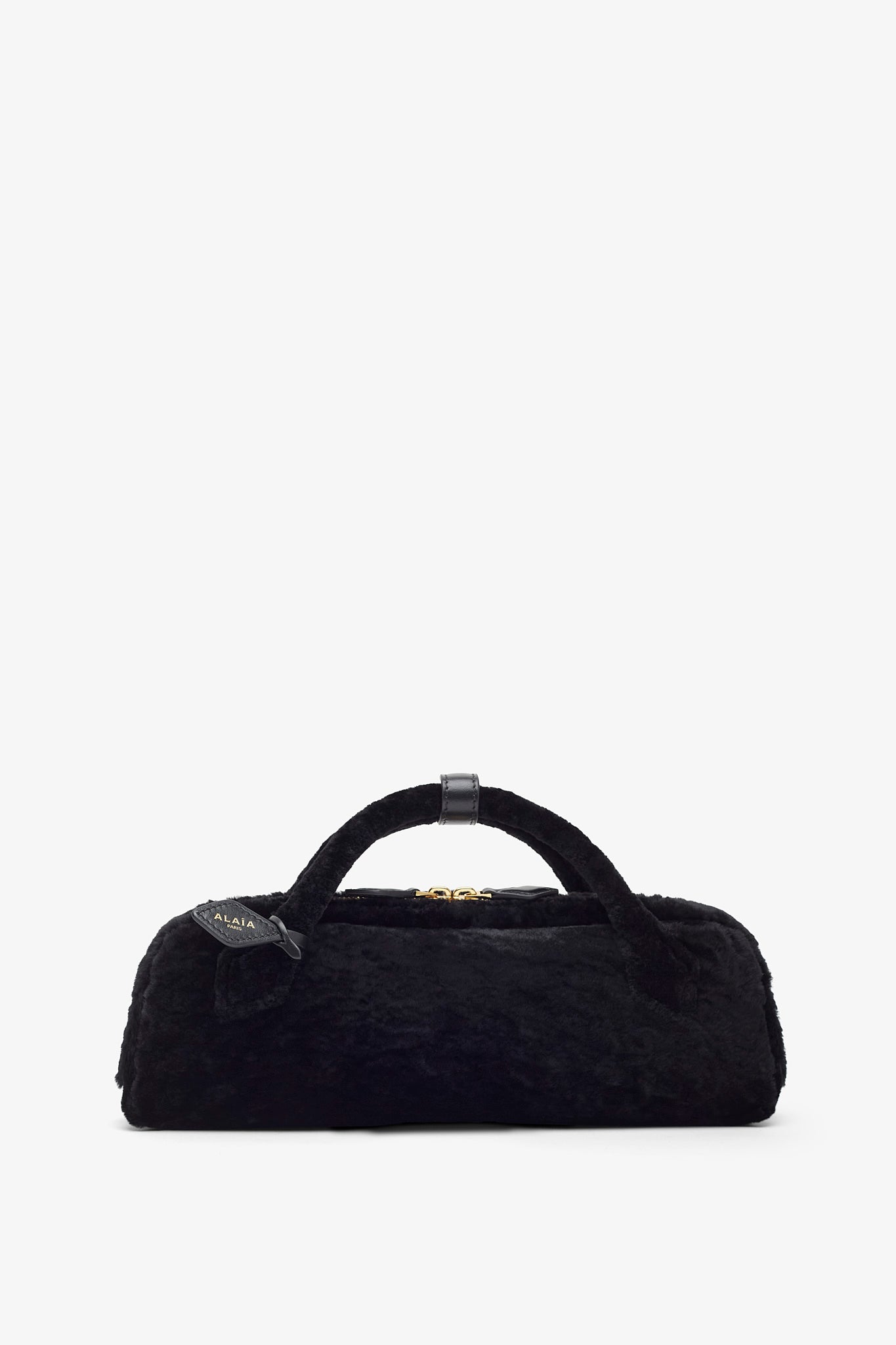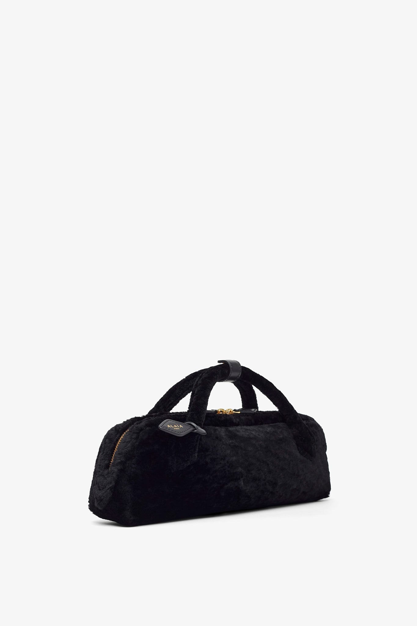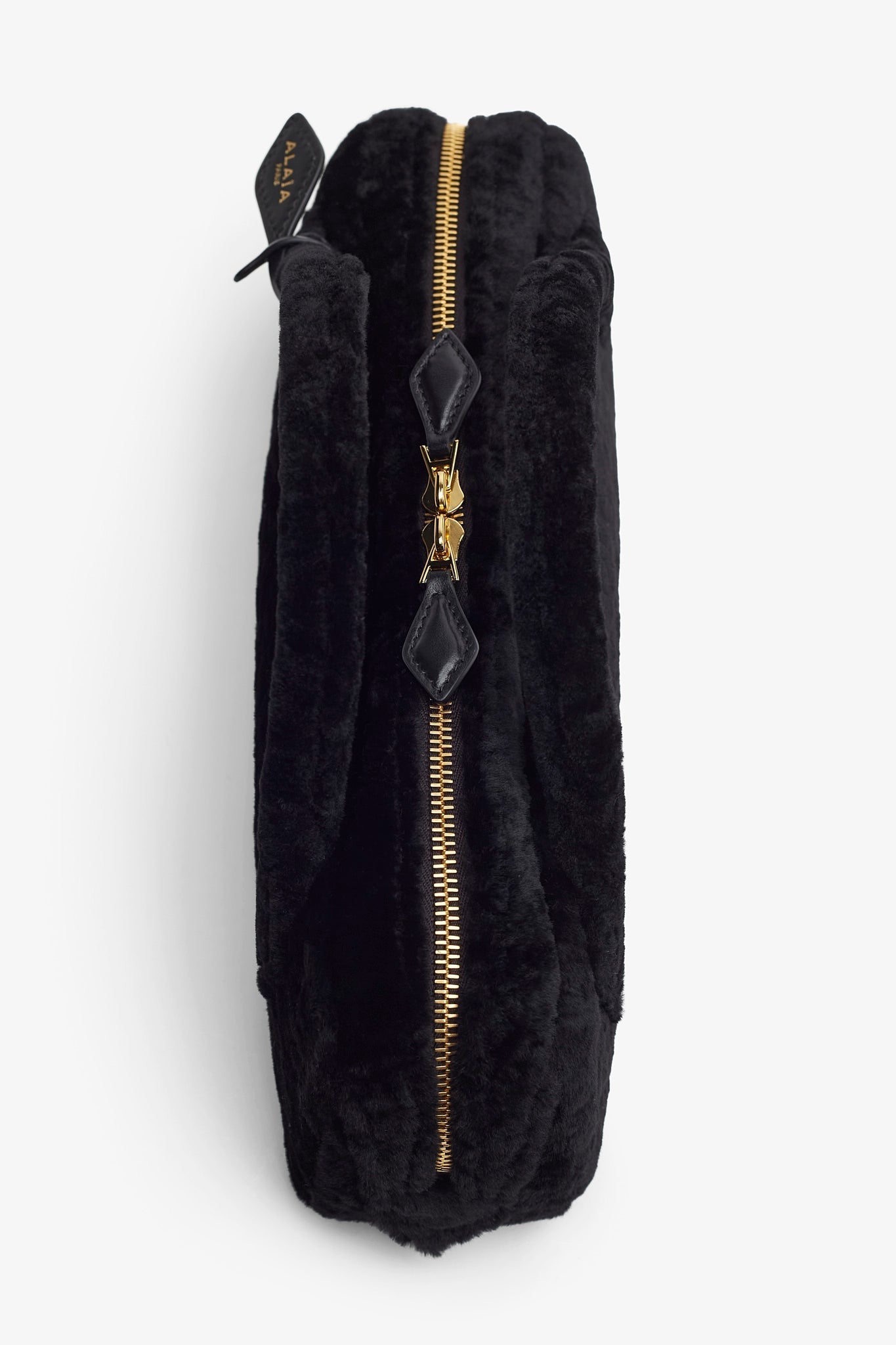 Black shearling clutch bag from Alaïa. The Le Teckel clutch bag is made in shearling in an elongated shape with tubular short handles with decorative ties, a double zip closure and small removable mirror on the inside pocket.