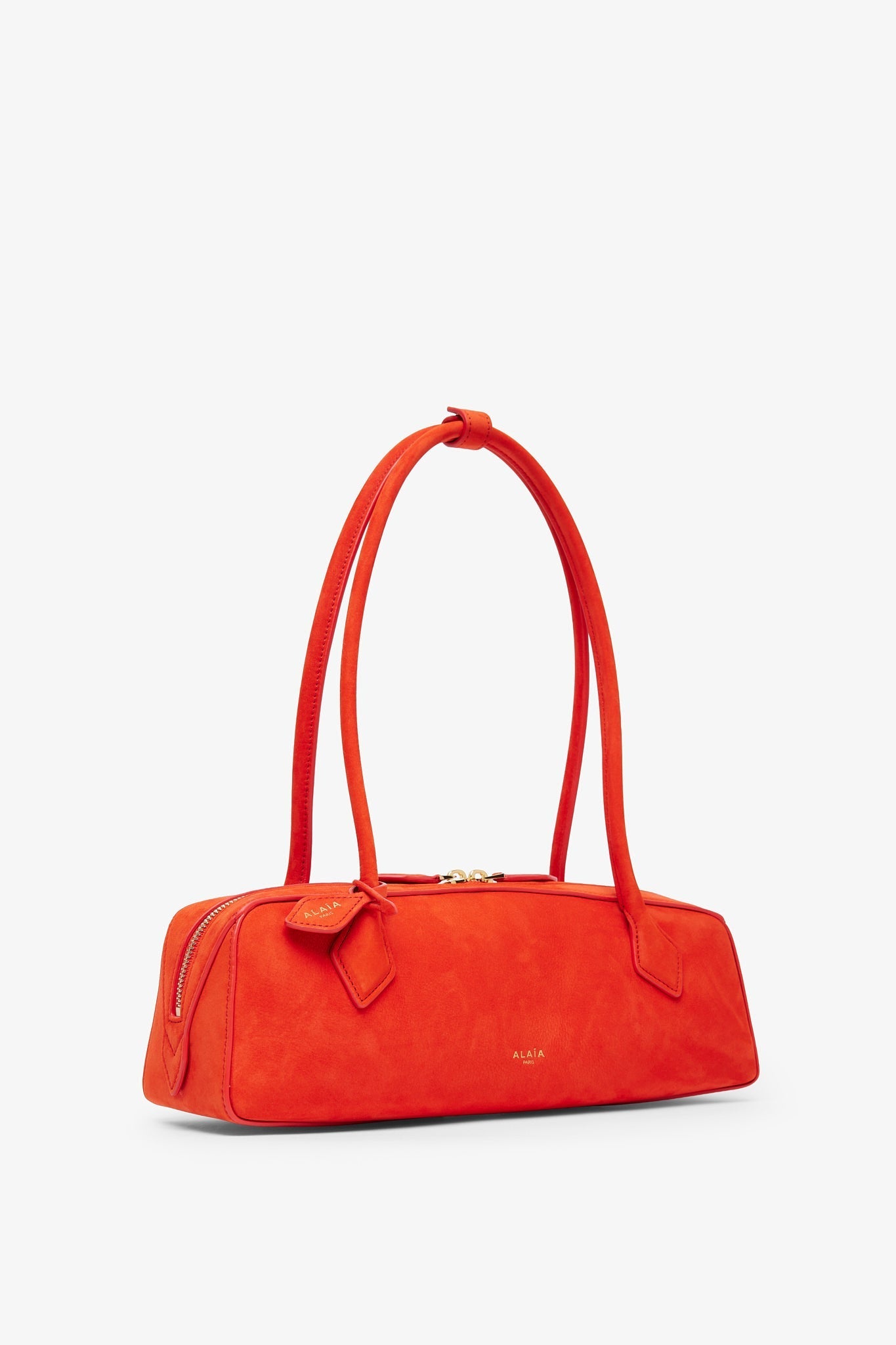 Orange shoulder bag from Alaïa. The Le Teckel bag is made of nubuck suede calf leather with extended shoulder straps, a two-way zip fastening along the top, complete with a slip pocket inside to fit you cards.