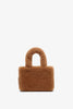 Brown shearling mini bag from Amina Muaddi. The Amini Giuly bag is made of shearling, featuring a magnetic closure along with a detachable and adjustable crossbody strap.