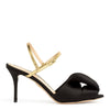 Black satin sandals from Charlotte Olympia. The sandals have a 80mm heel, a rounded toe and gold leather straps around the ankle.