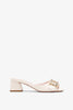 White patent leather mules from Roger Vivier. The Tres Vivier mules are made of patent leather with a squared toe and crystal buckle, set on a structured heel measuring 45mm.