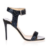 Navy course glitter leather sandal from Jimmy Choo. The Truce has a 100mm fine glitter covered heel, an adjustable ankle strap with silver-tone buckle detail, and a simple strap across the toe.