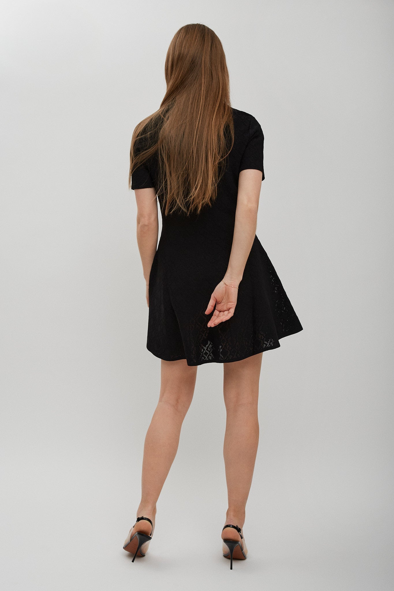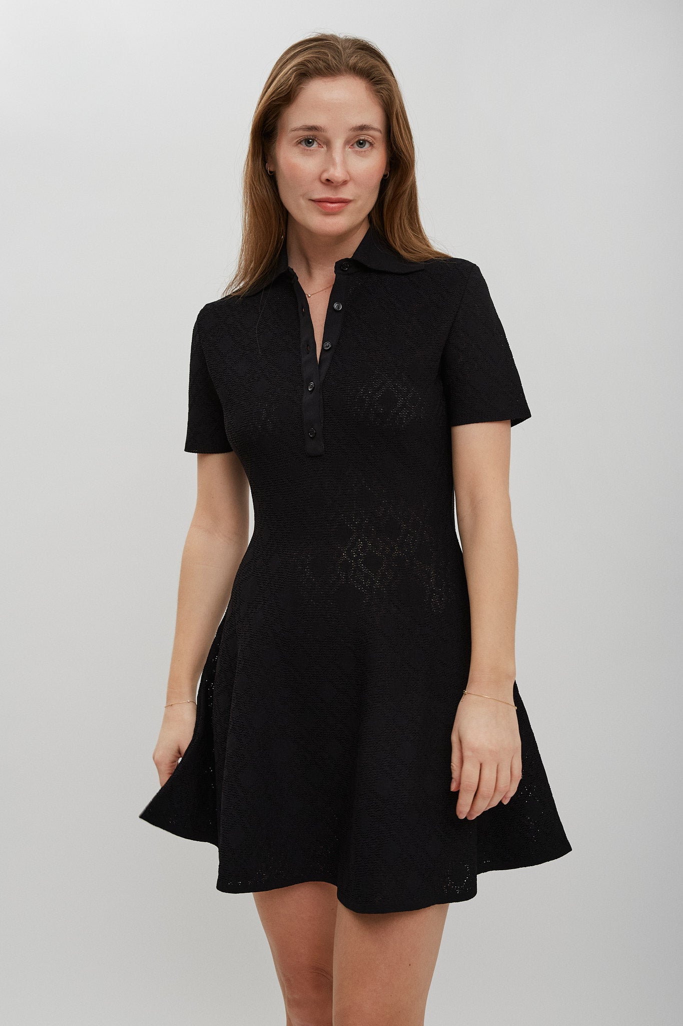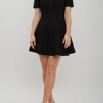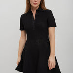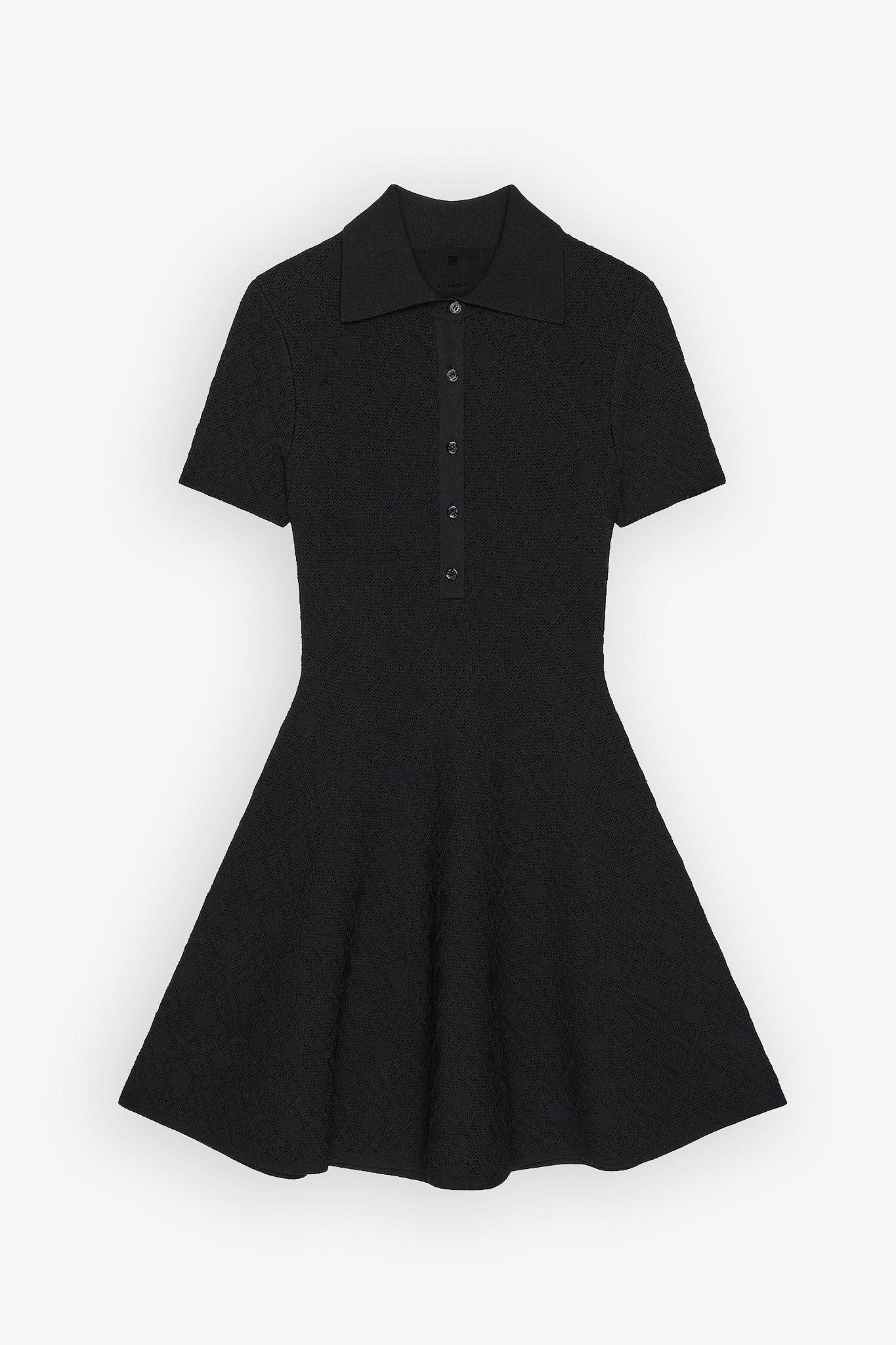 Black short dress from Givenchy. The dress is made in monogram 72 jacquard with short sleeves, polo button-down collar, and a flared skirt.