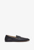 Black leather loafers from The Row. The Square loafers are made in grained calfskin leather with squared toe, stitched strap, and leather sole.