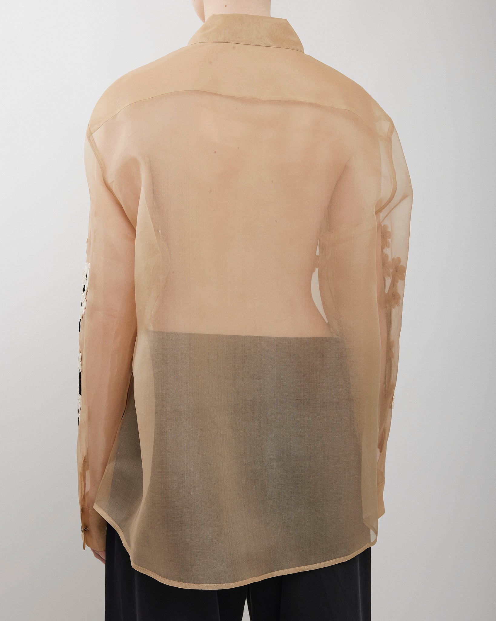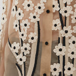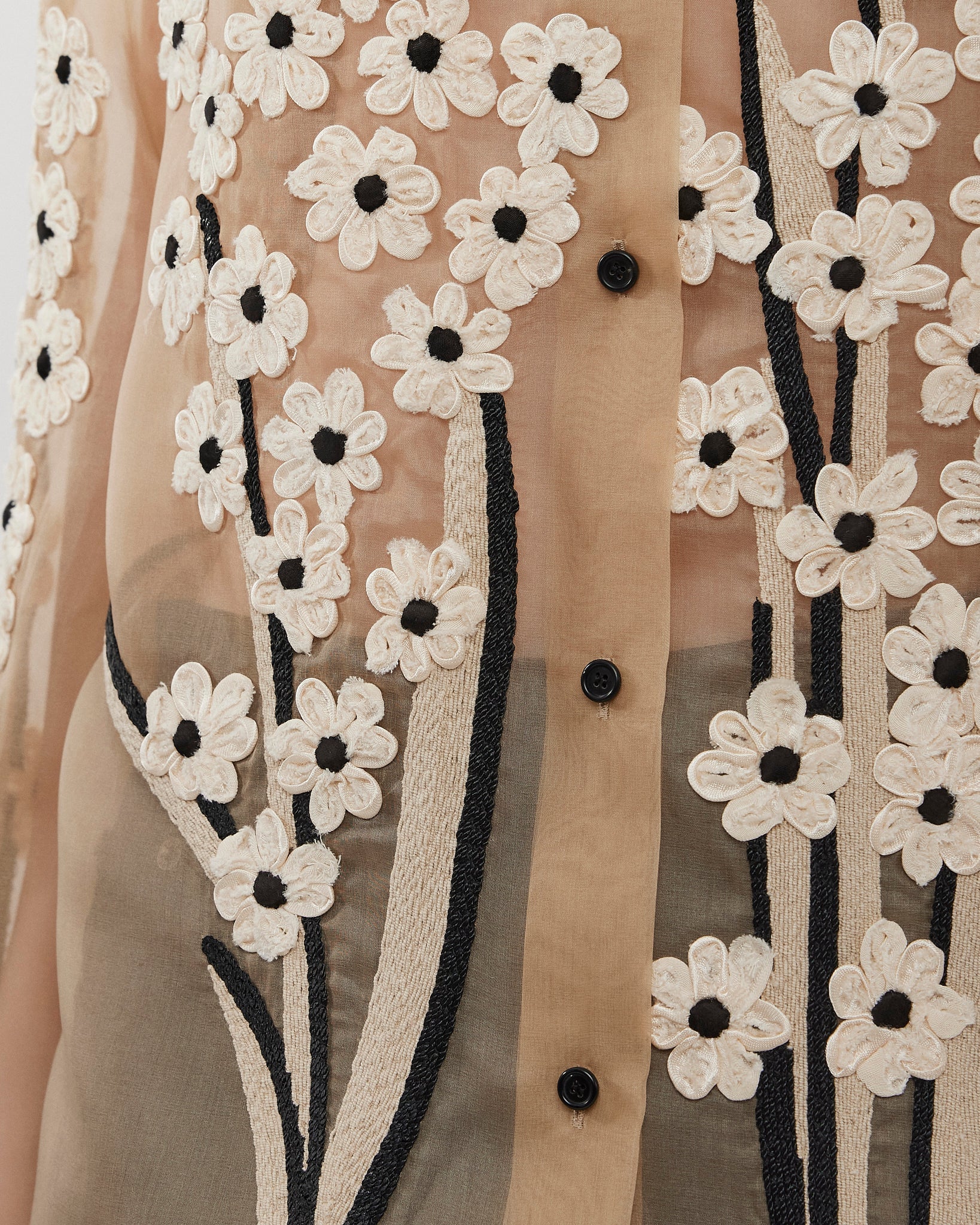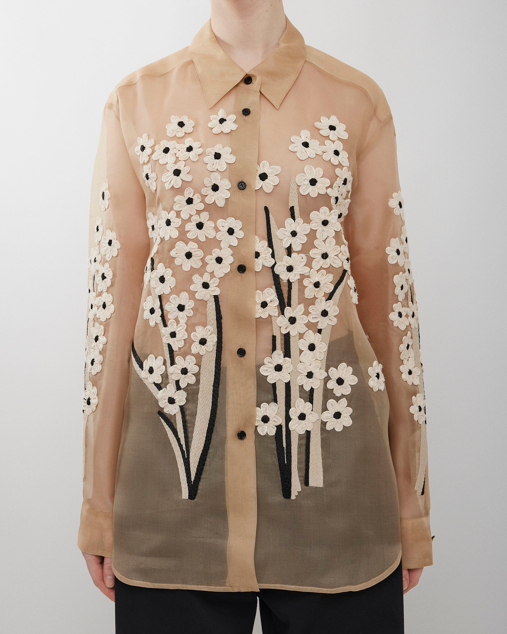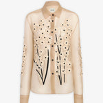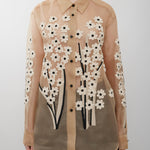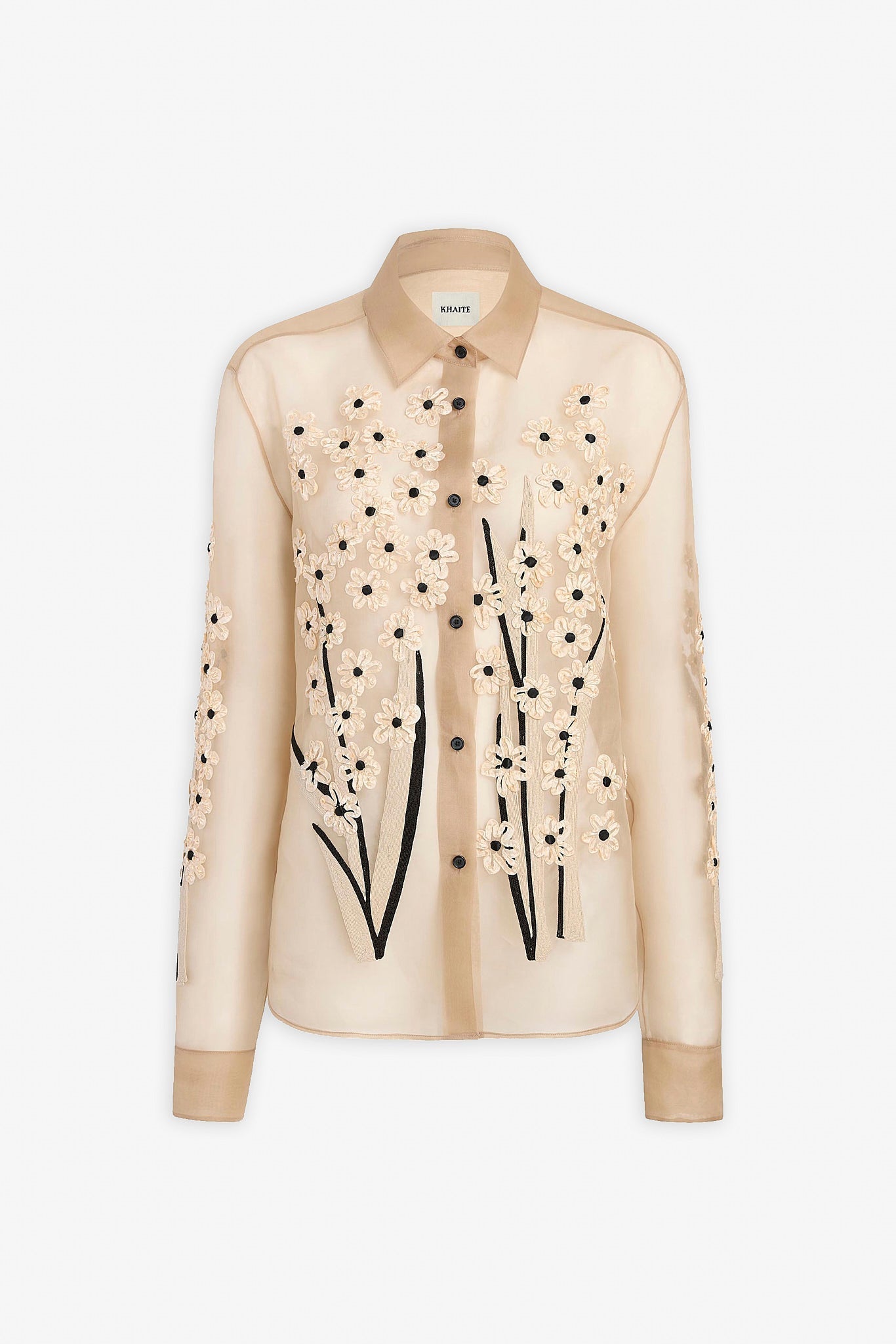 Beige silk floral blouse from Khaite. The Argo blouse is made in sheer silk organza with dimensional embroidery: flowers of satin ribbon and intricate cording, each element applied by hand. It is designed for a relaxed fit with back yoke, shirttail hem, and single-button cuffs.