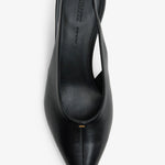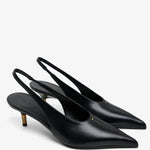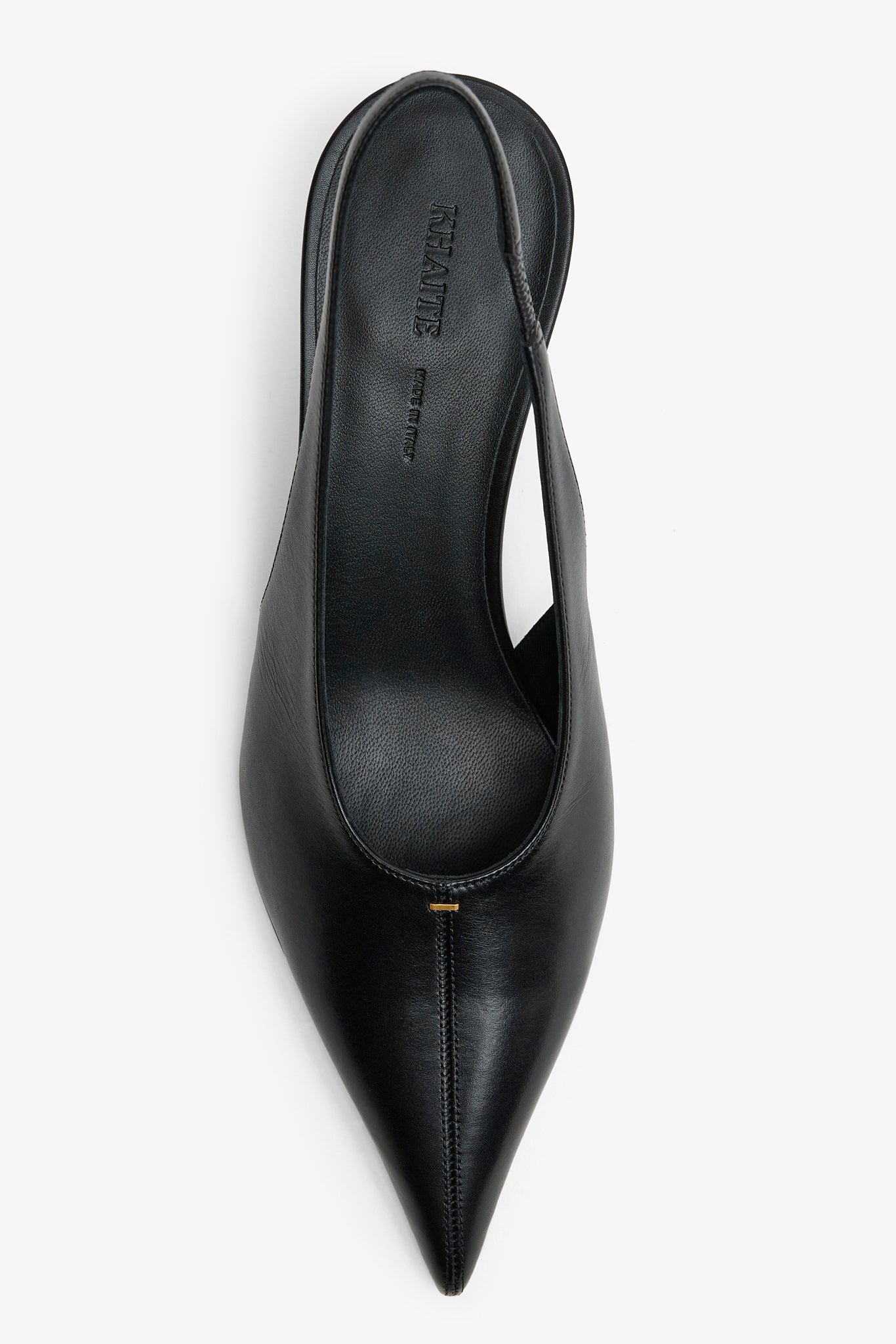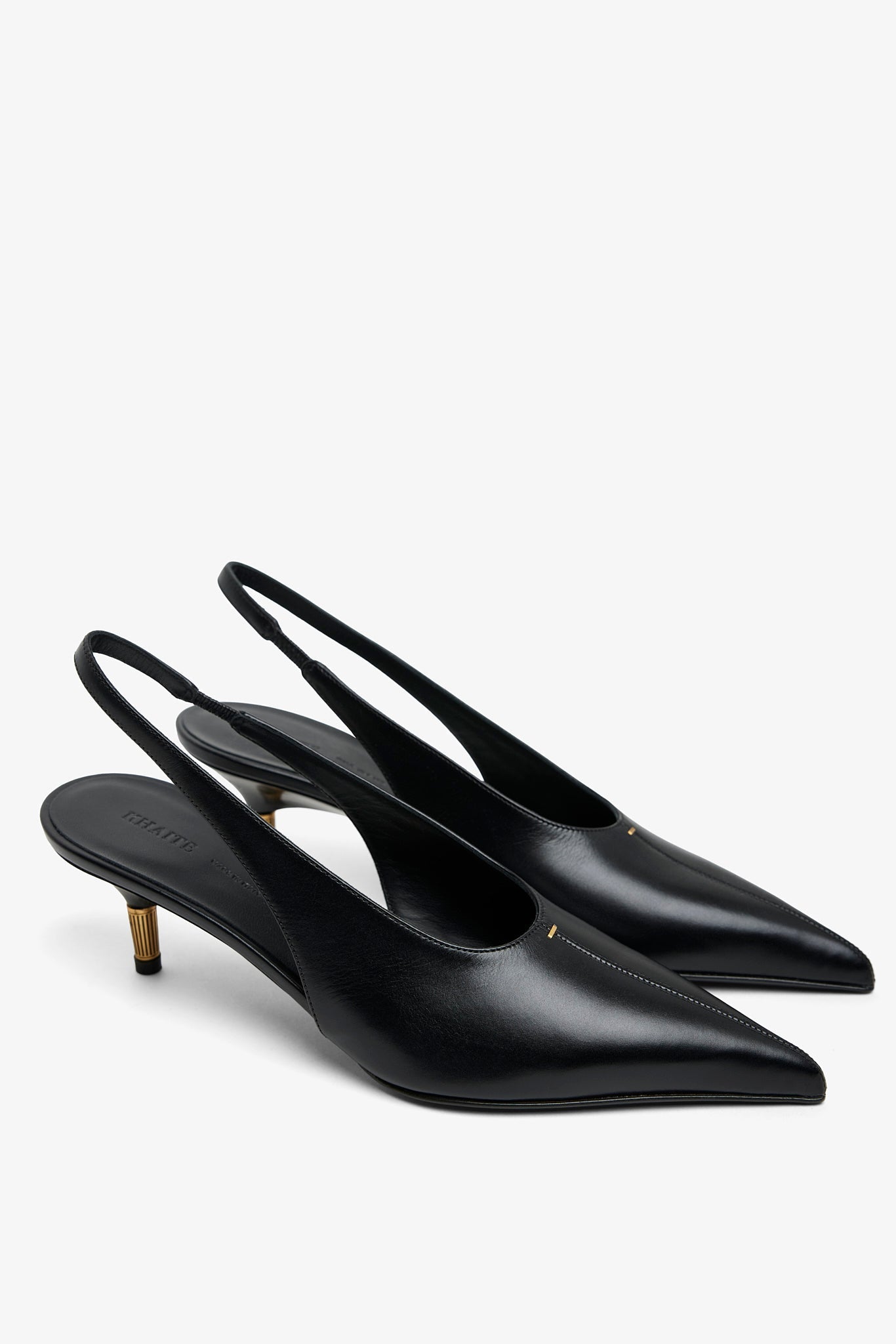 Black leather slingback pumps from Khaite. The Bella slingback pump is crafted in baby calfskin, features a pointed-toe, signature Empire hardware of 18-karat-gold-plated brass that tips the sculpturally wrapped wedge heel. Lined in goatskin.