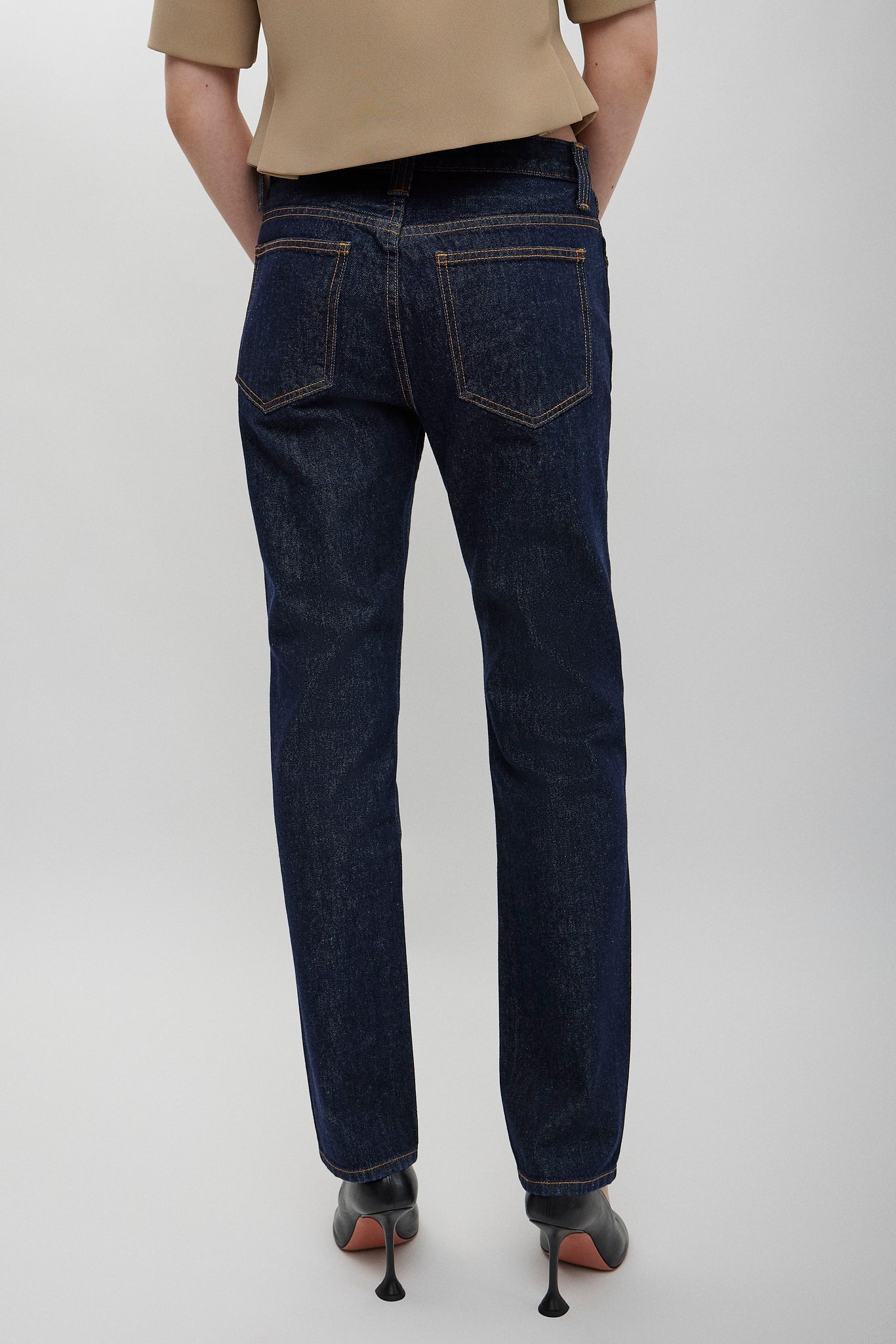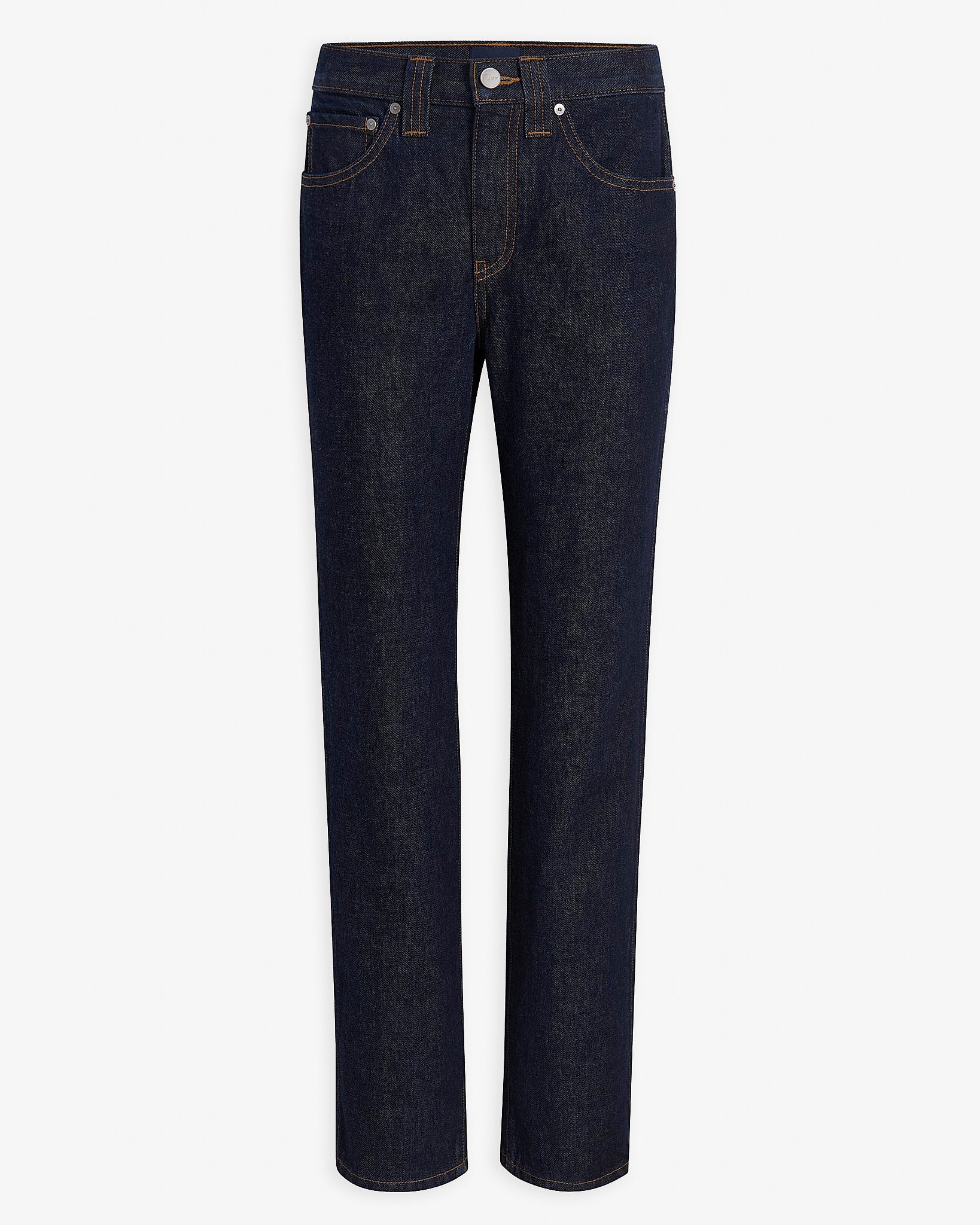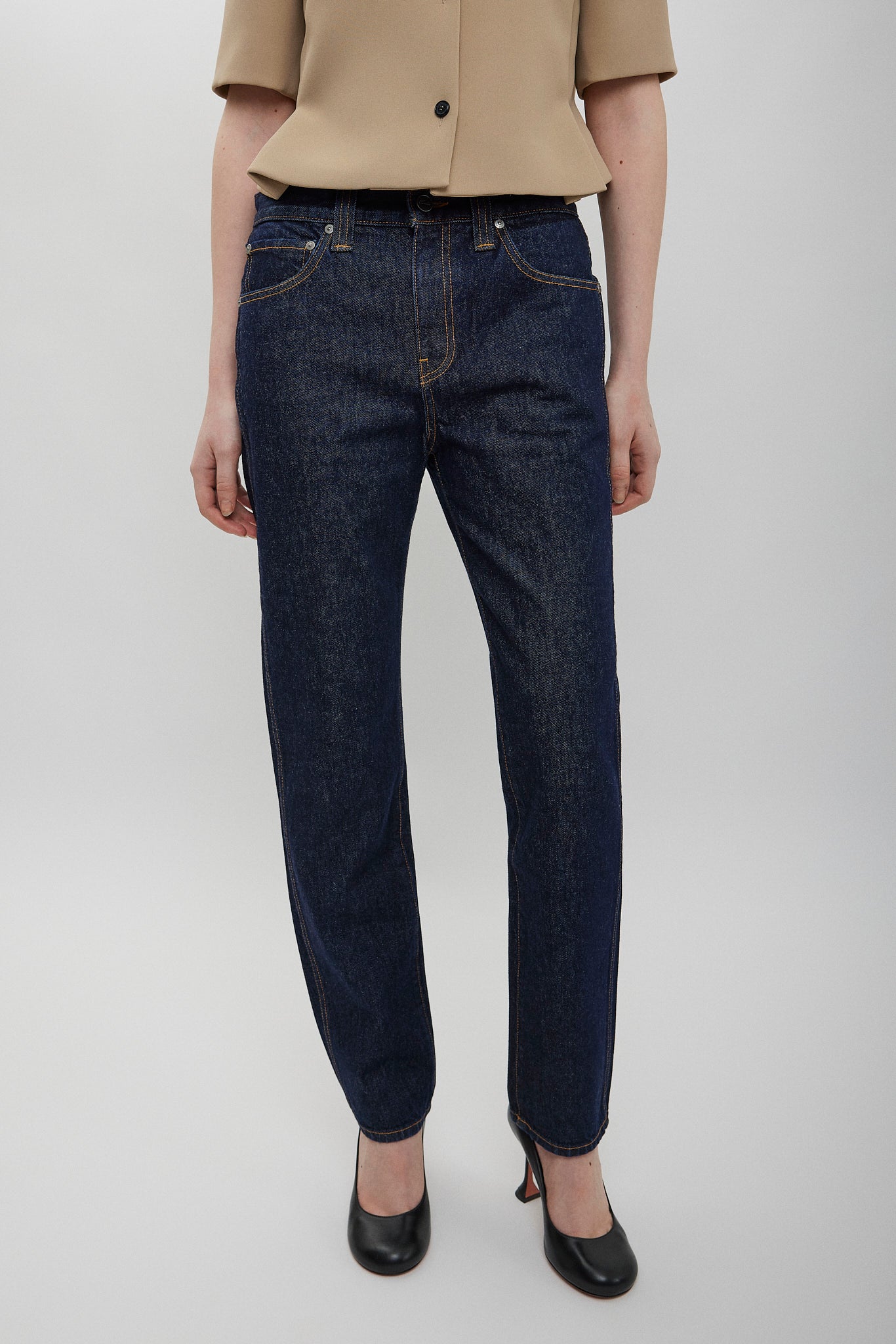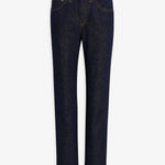 Dark blue cotton jeans from Khaite. The Farley jeans are made of cotton, designed to sit just below the navel with squared and slim lines, complete with a button of antiqued nickel.