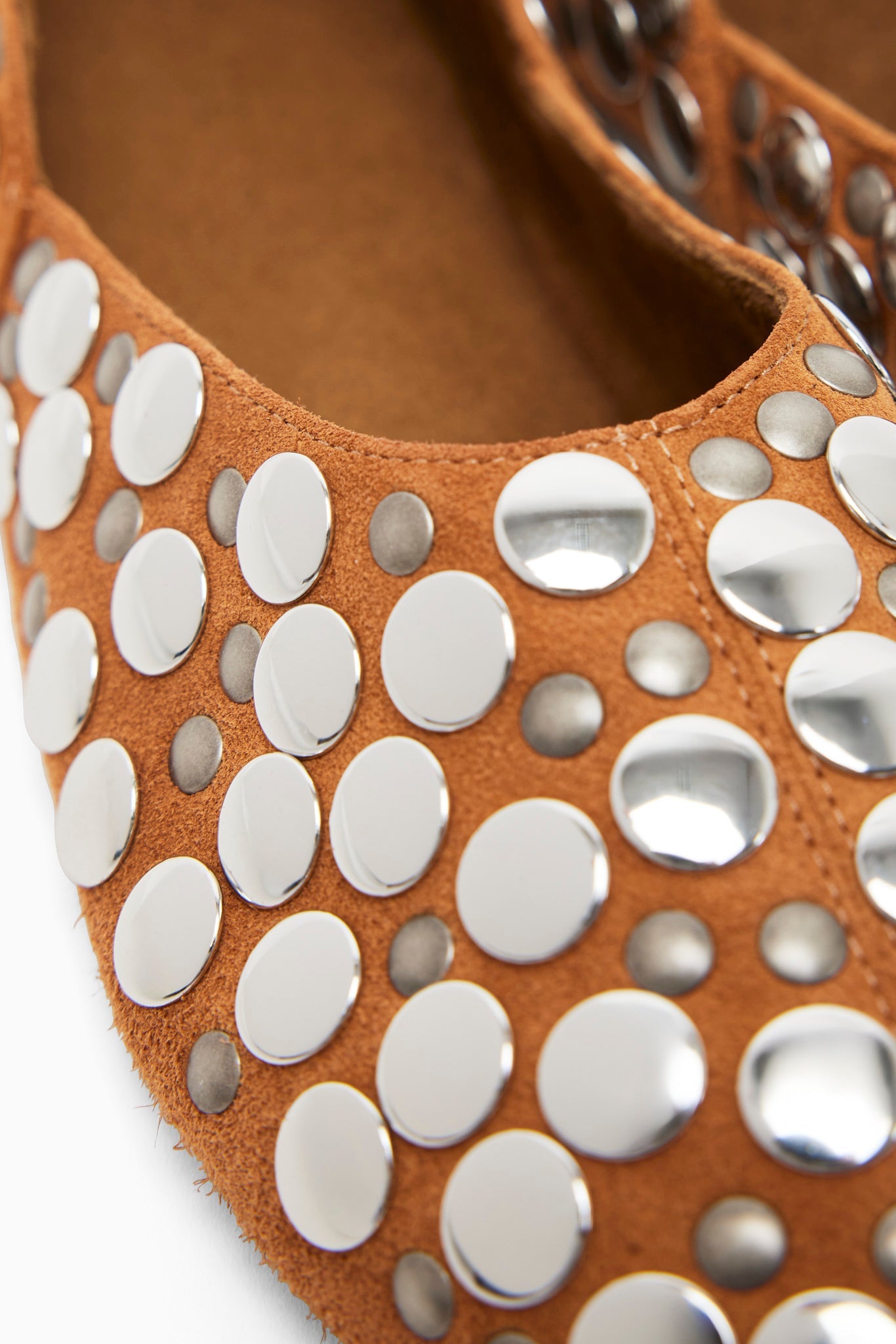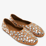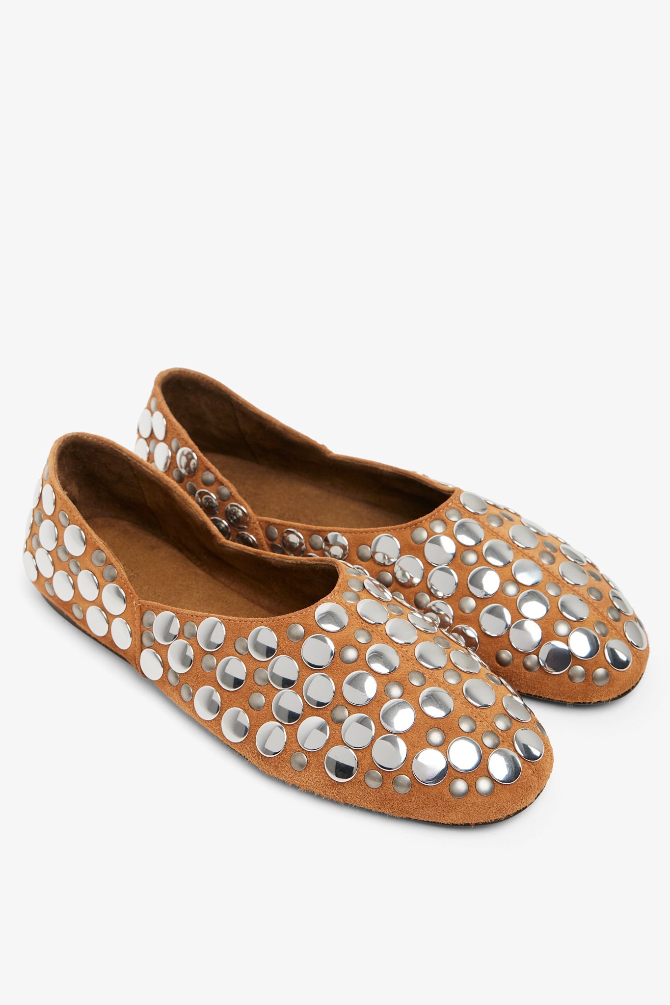 Tan studded suede flats from Khaite. The Jane flats are made of suede with a tonal lining, and the round-toe silhouette is adorned with silver-tone studs.