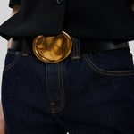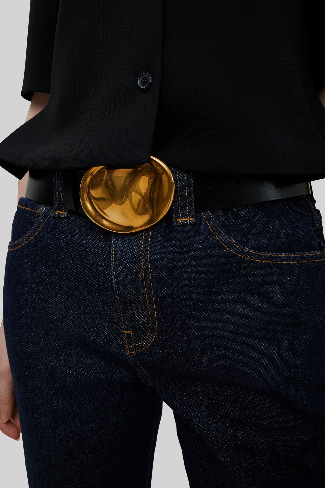 Black leather belt from Khaite. The Keefe belt is made in soft and supple calfskin leather, featuring a jewelry-grade hardware made in 18-karat-gold-plated brass.