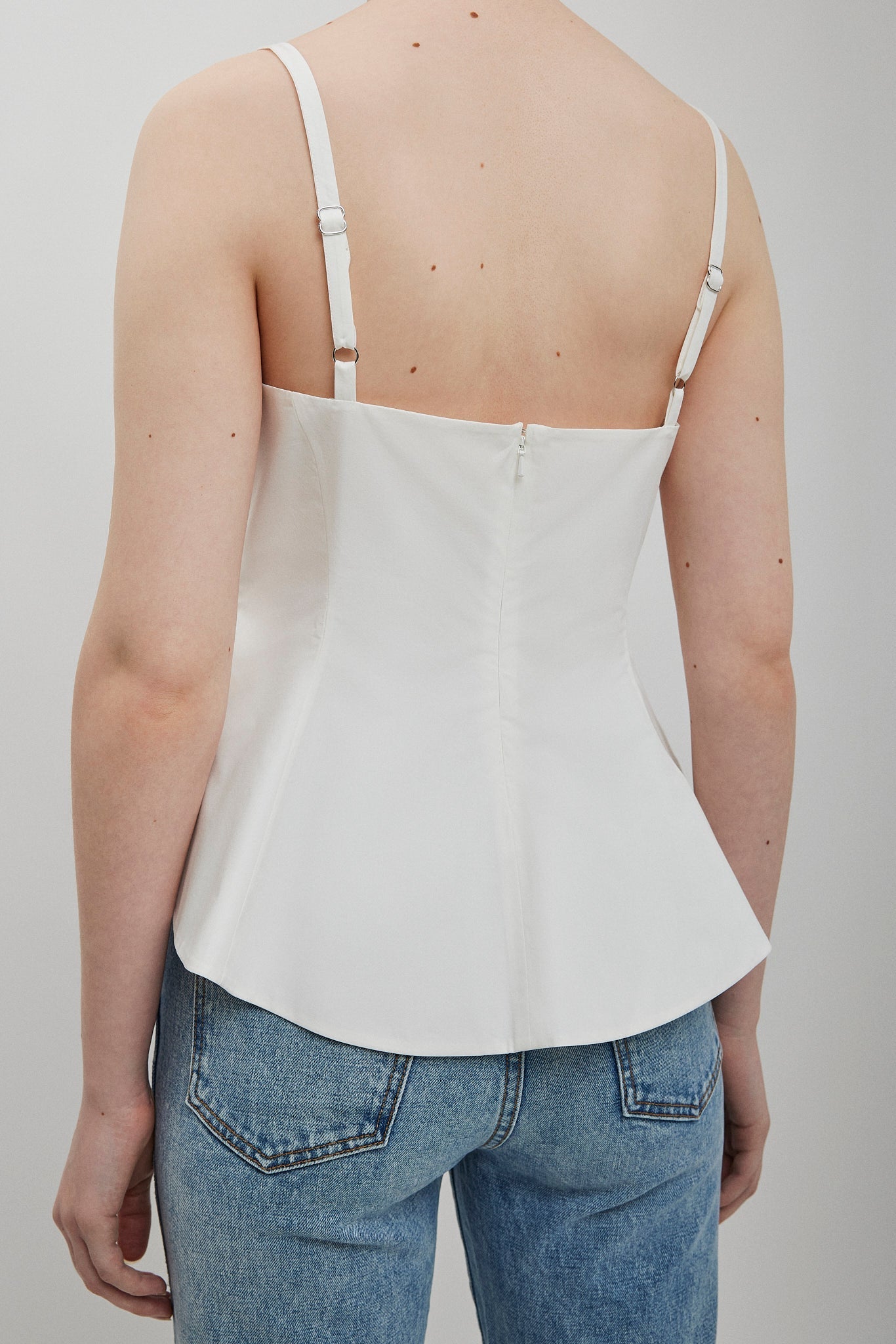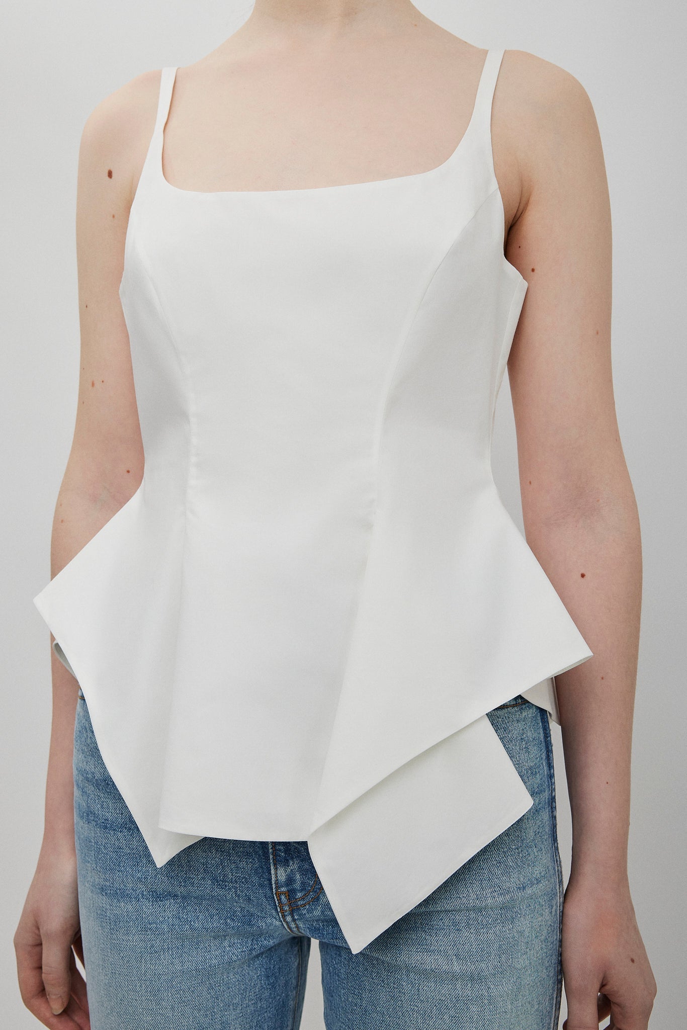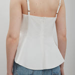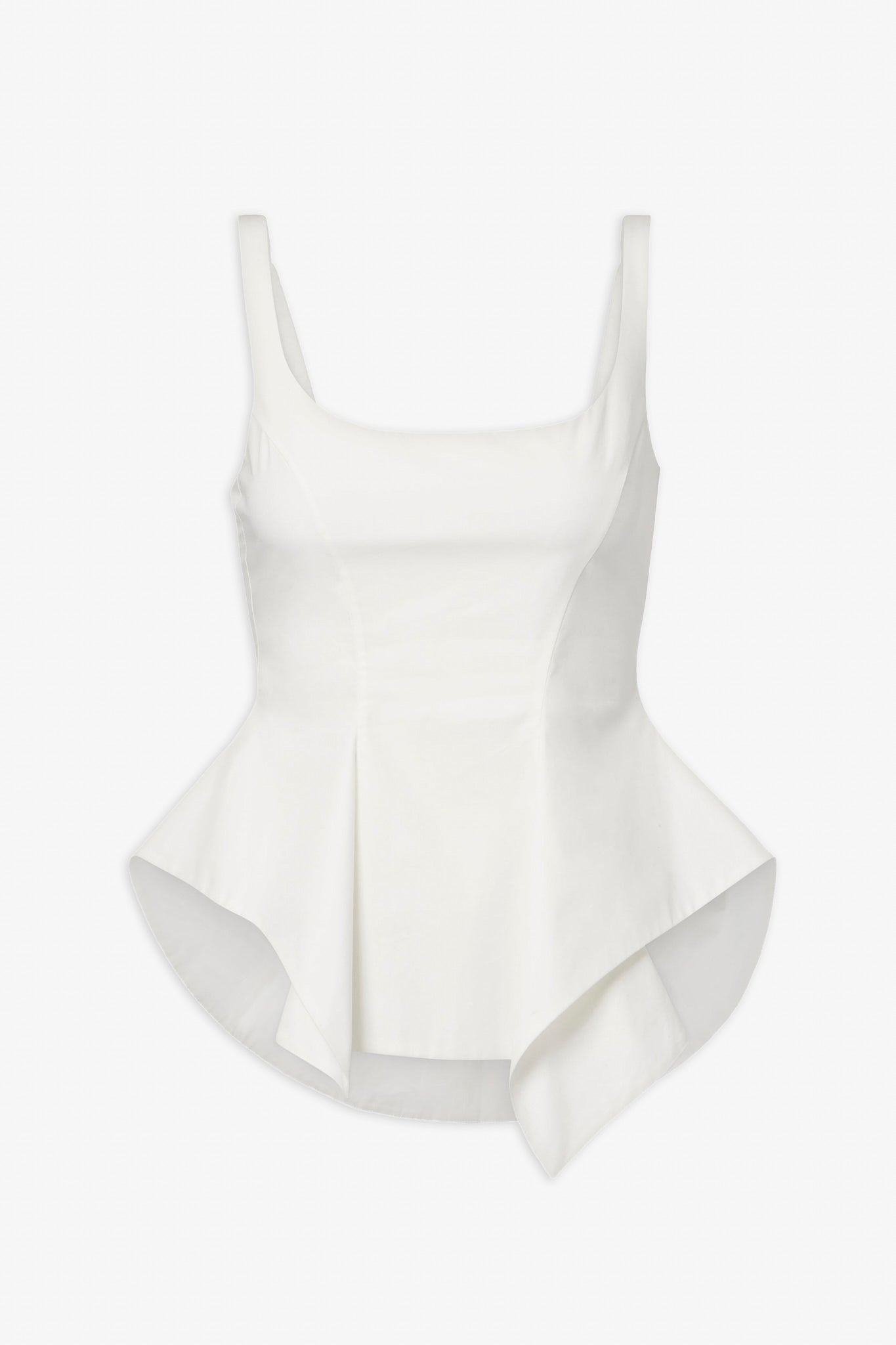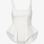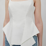 White cotton top from Khaite. The Loa top is made from crisp cotton poplin in a chalk white hue. It has a fitted body with an artfully draped, asymmetric peplum hem that sculpts the figure.