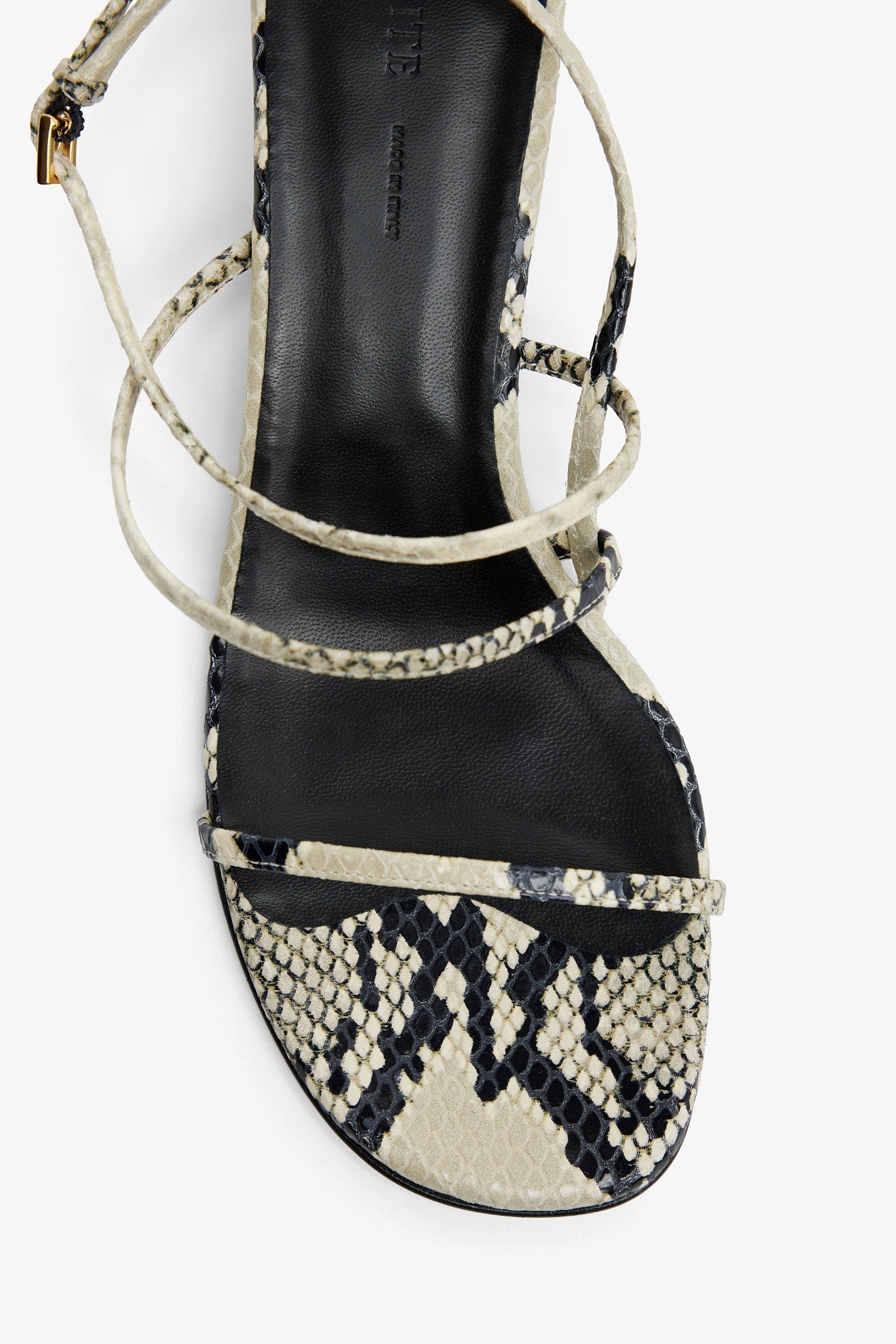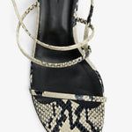 Snake printed leather sandals from Khaite. The Loop kitten heel sandals are constructed in soft snake printed calfskin leather, with thin straps that wrap around the foot and secures with a buckle closure around the ankle. Sits on a 35mm heel.