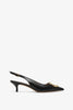 Black leather slingback from Ferragamo. The Sara slingback is made of kidskin leather, with a pointed profile and rounded vamp, decorated with an oversized gold-toned Gancini motif. It is set on a thin leather-covered heel measuring 40mm.