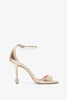 Gold jewel heel sandals from Roger Vivier. The Jewel Heel sandals are made in metallic gold ovine nappa leather, featuring a crystal heel embellishment, crystal embellished buckle closure around the ankle and a leather insole with a heart-shaped insert. Set on a 100 mm stiletto heel.