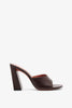 Brown leather mules from Amina Muaddi. The Brigitte mules are made of brown leather with a peep toe, set on a 95mm slanted block heel.