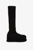 Black knitted stretch ankle boots from Amina Muaddi. The Veneda platform boots are made of wool with sheepskin lining. It has a rounded toe, fits below the knee and is complete with a 15mm platform.