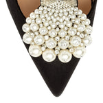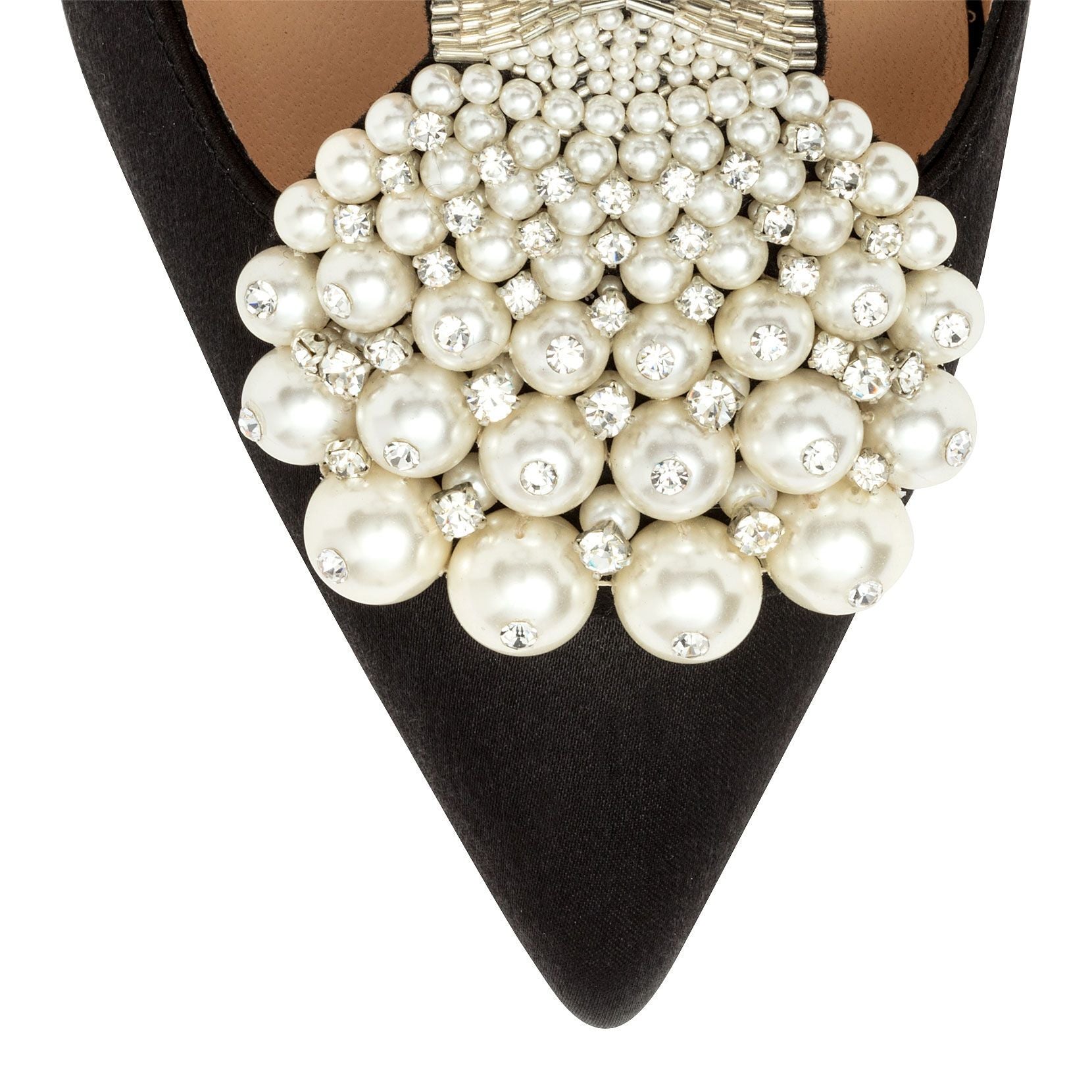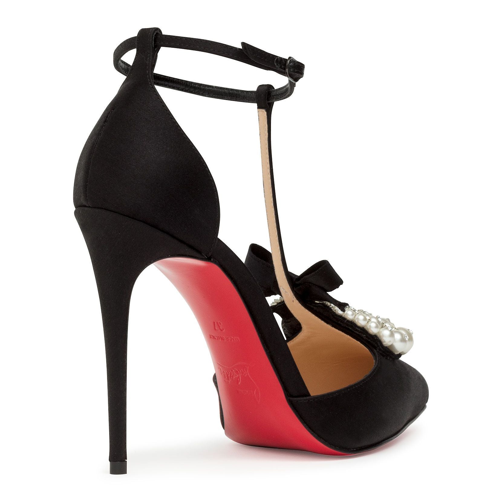 Black satin pumps from Christian Louboutin. The Goyetta pumps have a 100mm heel, a pointed toe and a T-strap and a crystal and pearl embellishment finished with a satin bow.True to size