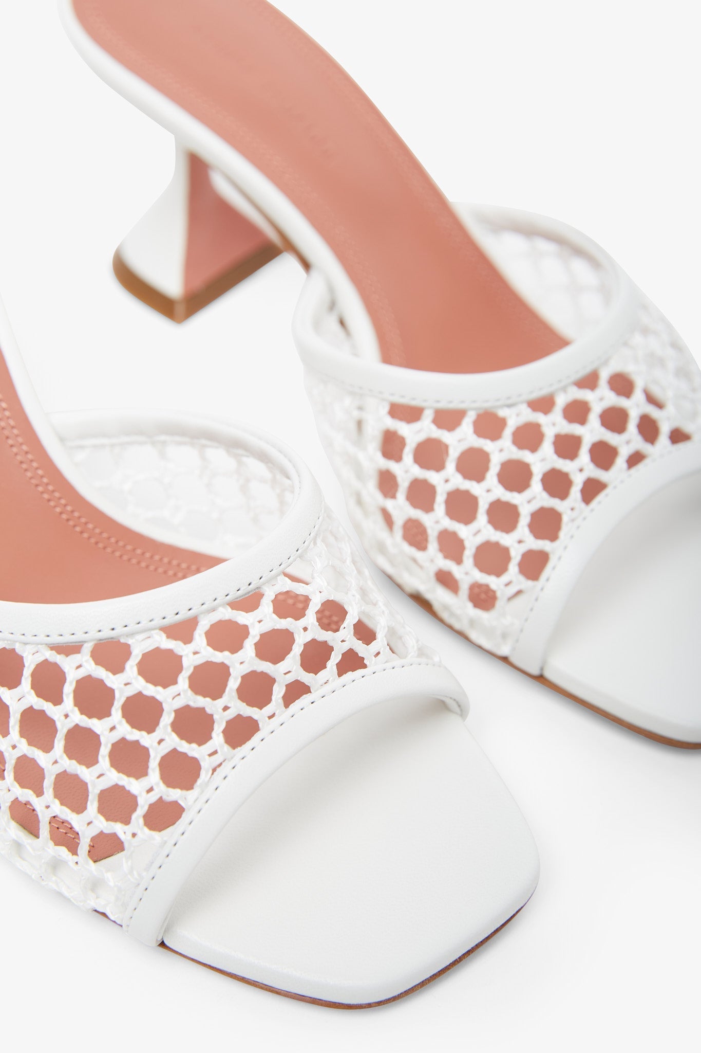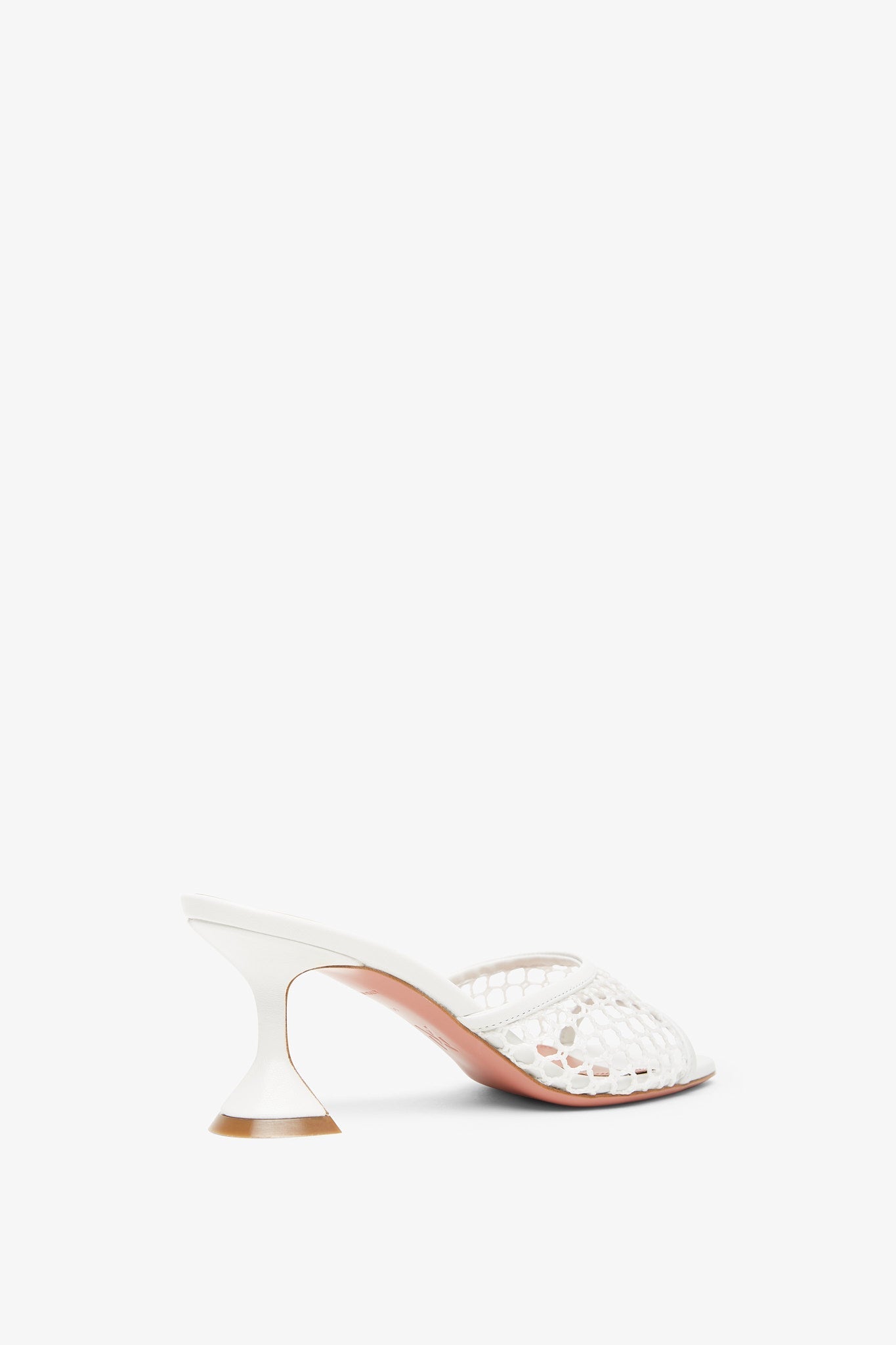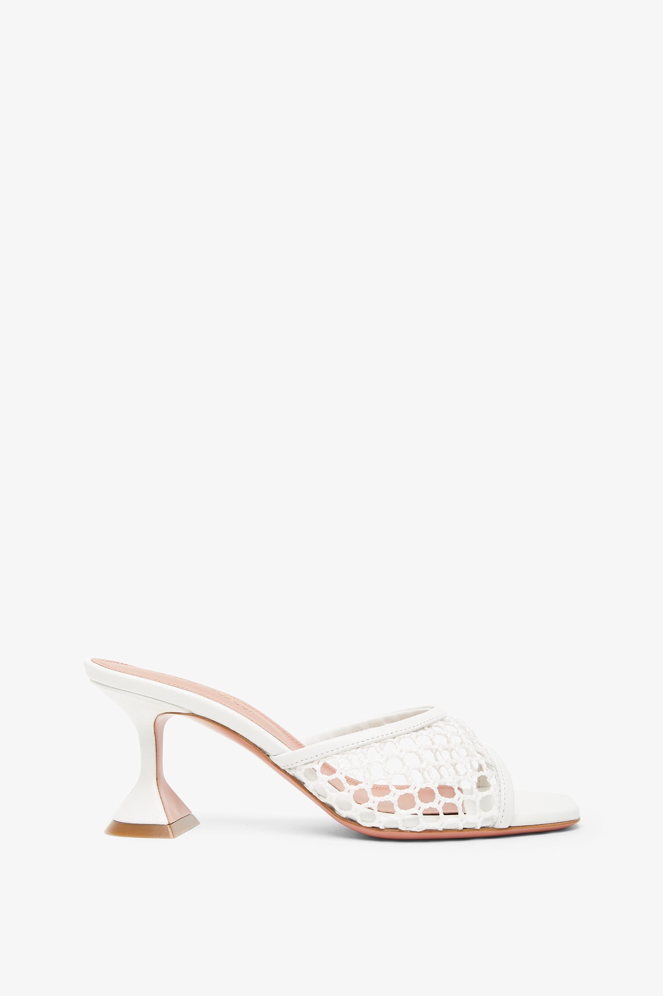White leather and fish net mules from Amina Muaddi. The Lupita mules are made of white mesh fish net and leather with a square toe, leather lining and insole, featuring the designer’s signature "Martini" heel measuring 70mm.