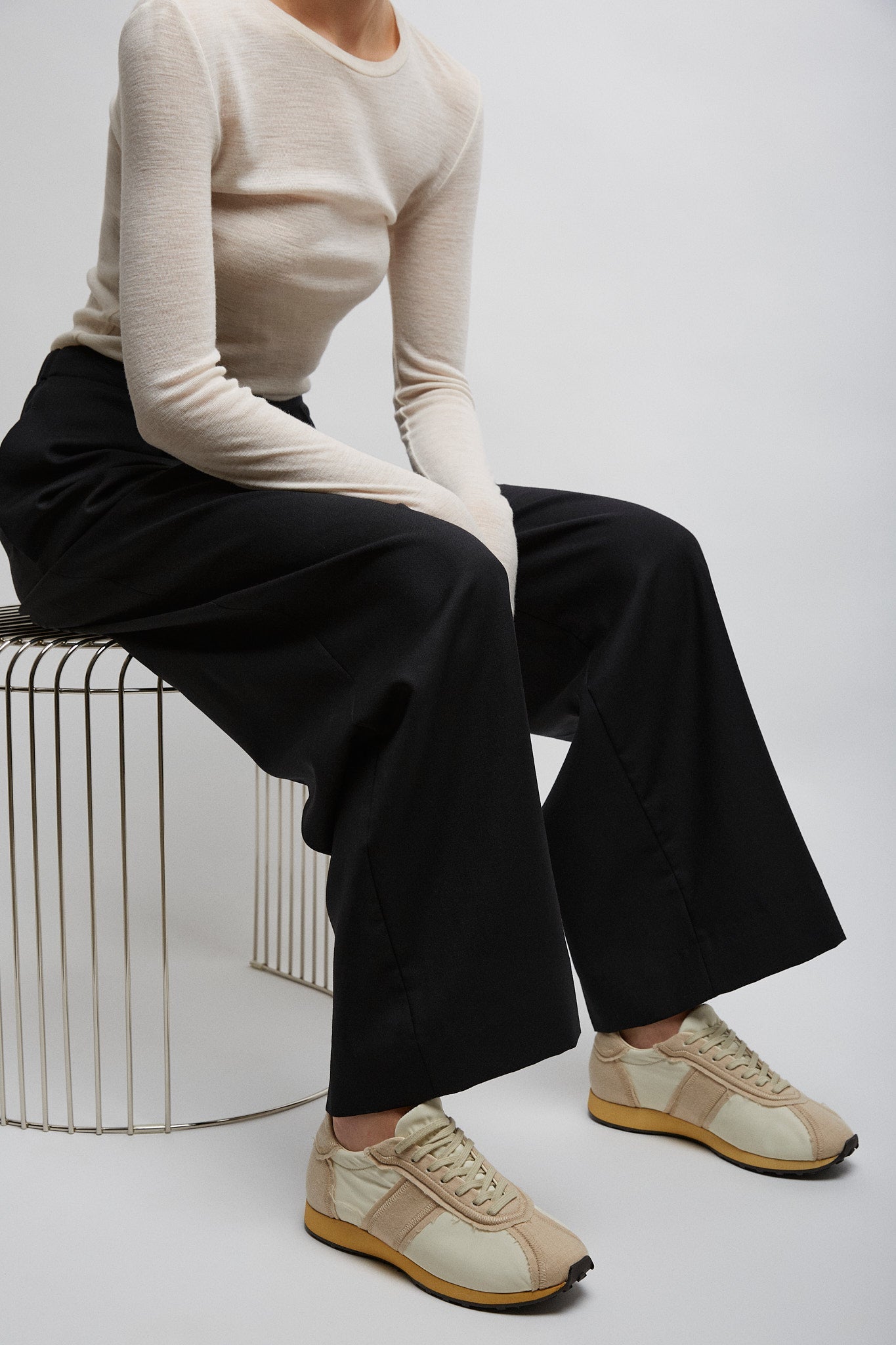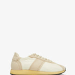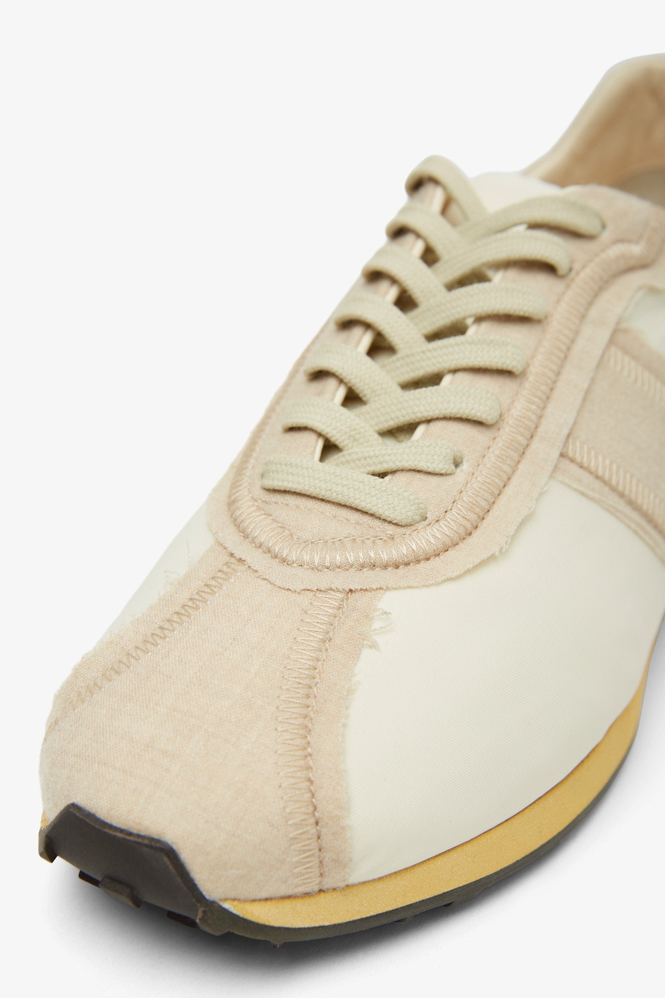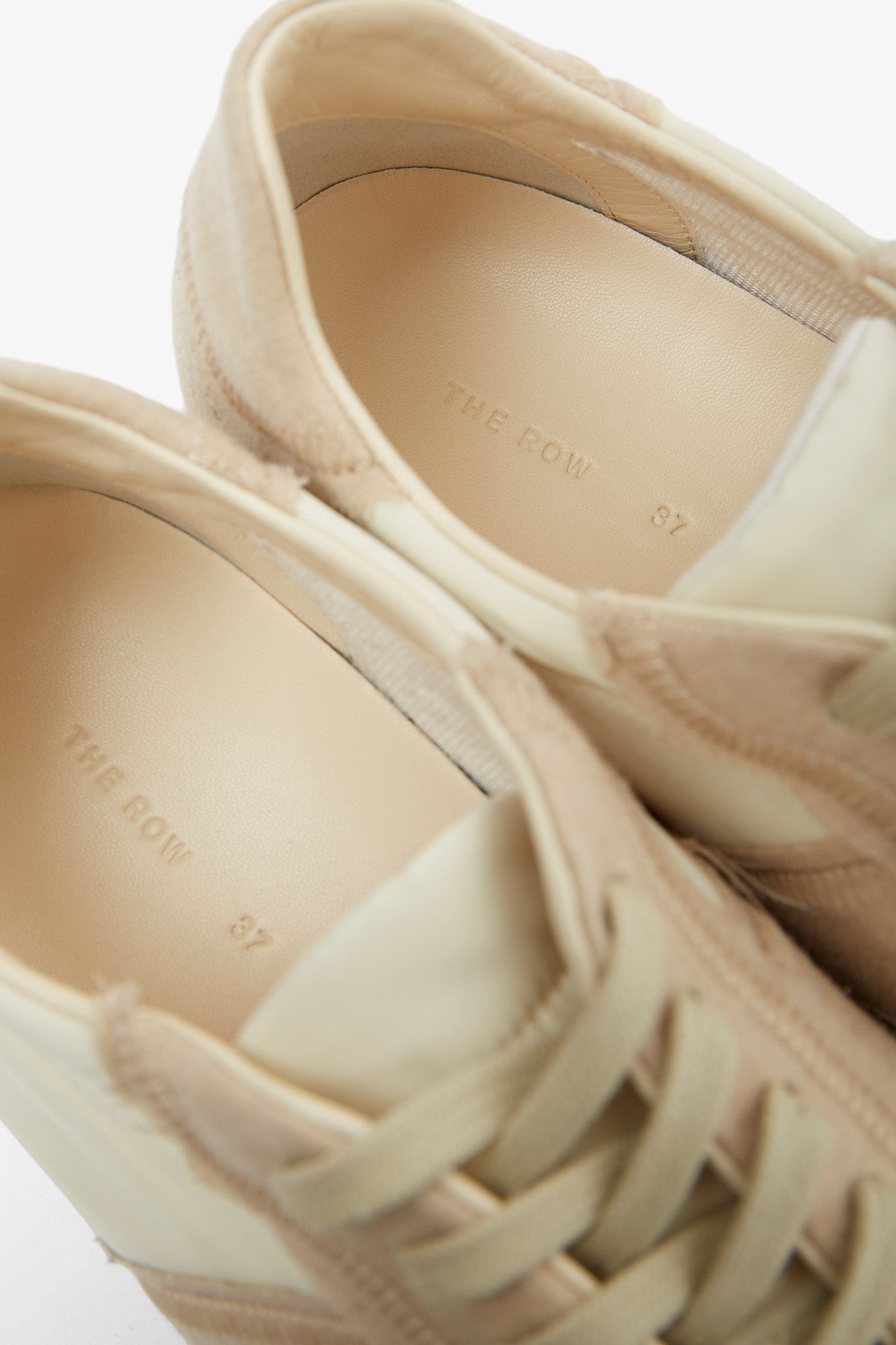 Beige and off white cashmere and nylon sneakers from The Row. The Mica sneakers are made of beige cashmere and off white nylon, complete with tone-on-tone stitching, an almond-shaped toe, classic lacing system, cushioned sole with micro rubber tread. Nappa leather lining inside.