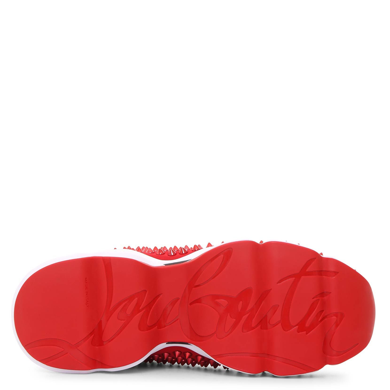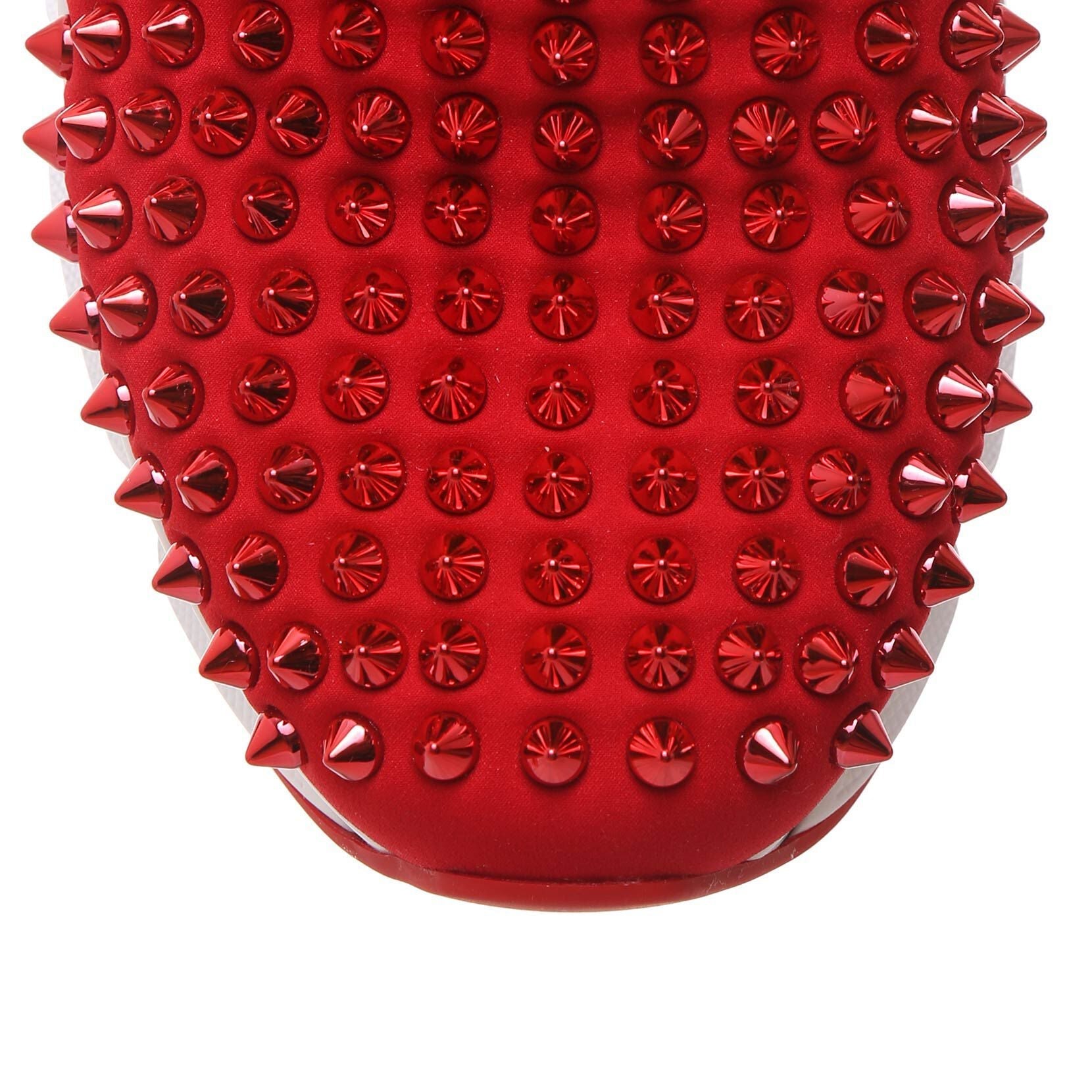 Red stretch sneakers from Christian Louboutin. The Spike Sock sneakers have a rounded toe and all-over metallic red spikes, red stretch lining and a red leather pull-on tab at the heel.