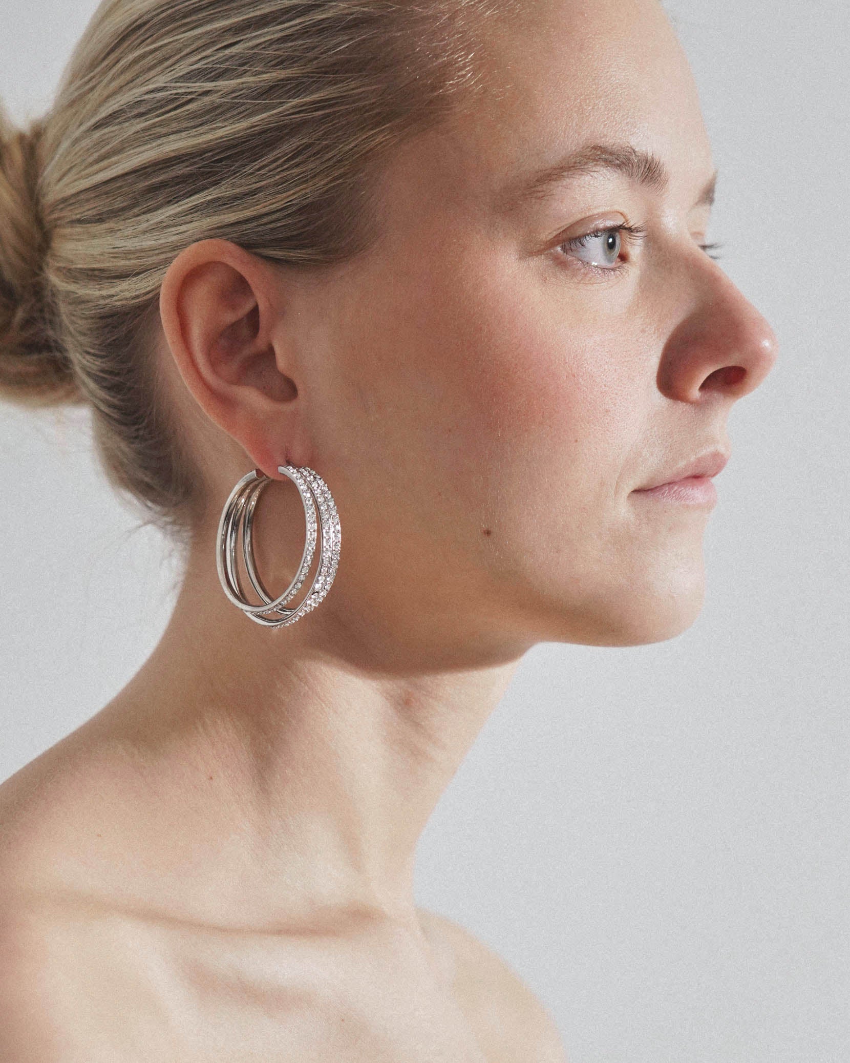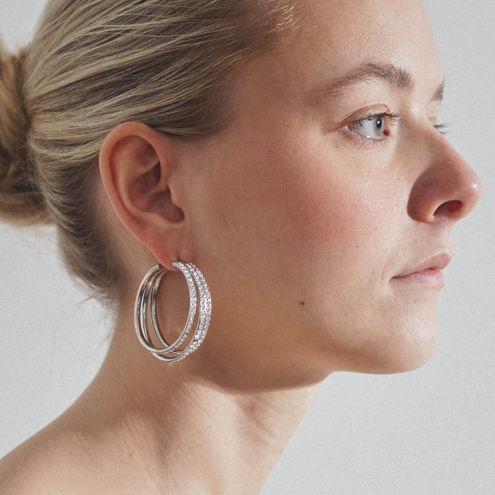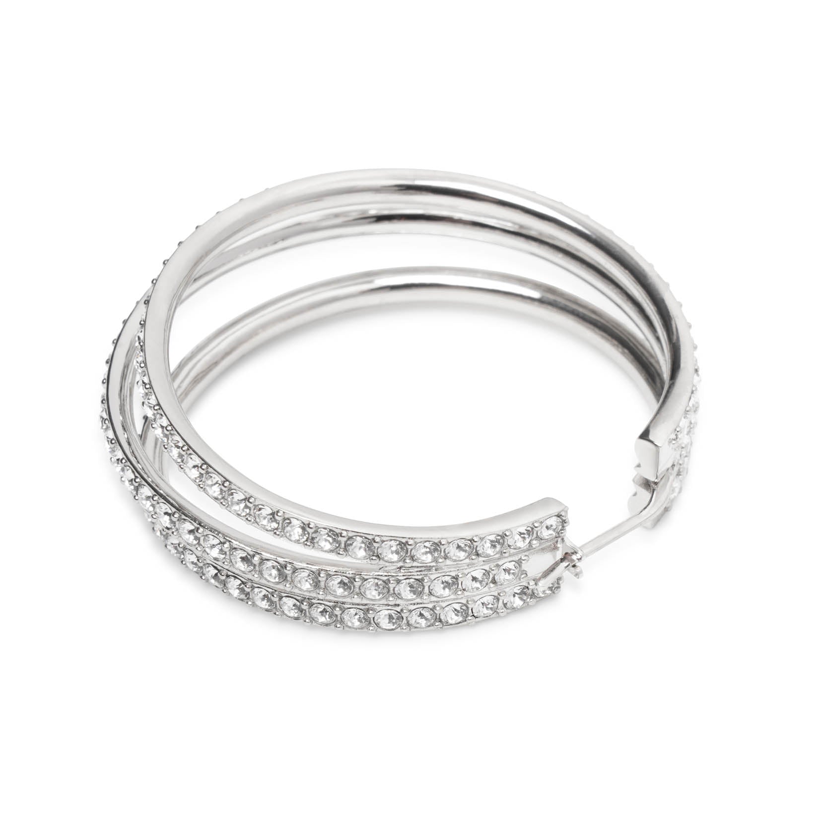 Silver pleated earrings from Amina Muaddi. The Vittoria hoop earrings are made of crystal and silver-tone metal, detailed with crystal embellishments. The earrings are 45mm in diameter.
