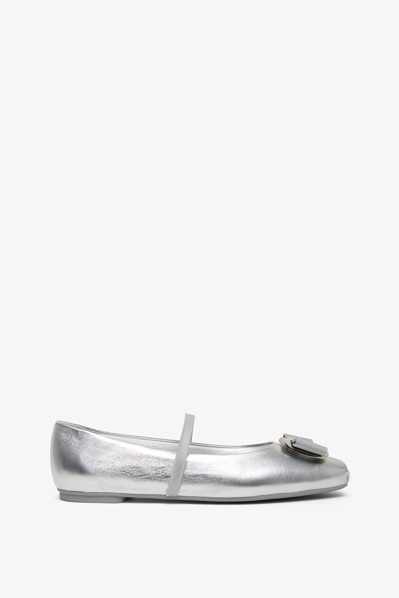 Silver leather ballet flats from Ferragamo. The Zina ballet flats are made of soft laminated leather with ruffles at the pointed tip. It has a square-shaped toe, a gros grain elastic upper complete with a Vara bow held by the new Ferragamo buckle at the toe.